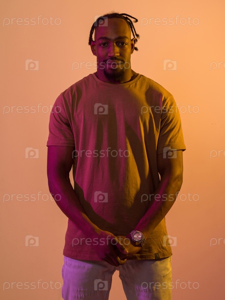 Афроамериканец с современной и стильной прической излучает уверенность и харизму, когда он принимает позу на оранжевом фоне, демонстрируя смелое и яркое выражение современной моды и индивидуальности