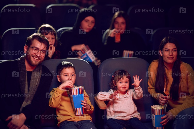 Современная семья приятно проводит время вместе в кинотеатре, наслаждаясь попкорном во время просмотра фильма со своими детьми