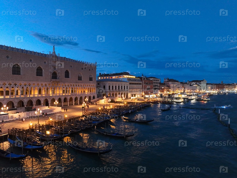 Панорамный городской пейзаж Венеции на закате или ночью, вид с воздуха на площадь Сан-Марко