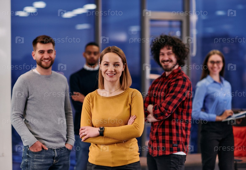 Портрет успешной творческой бизнес-команды, смотрящей в камеру и улыбающейся. Разнообразные деловые люди стоят вместе при запуске. Селективный фокус