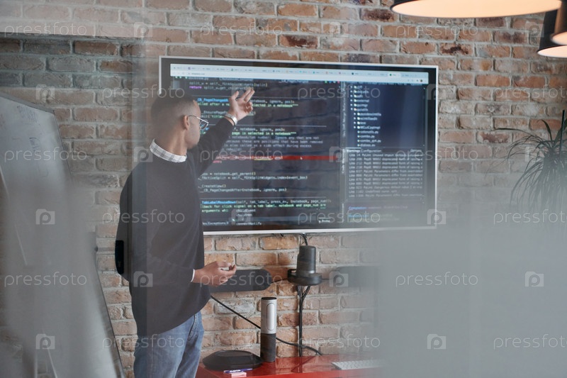 Афро-американский бизнесмен ведет встречу, страстно представляя бизнес-план своей внимательной команде, способствуя сотрудничеству и стратегическому мышлению