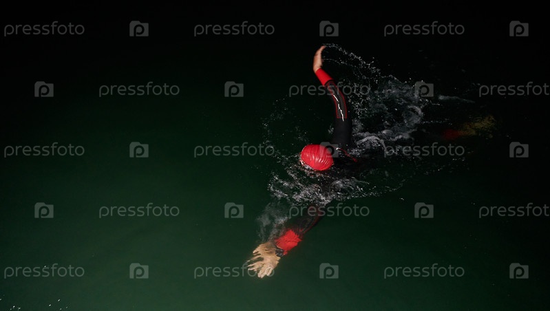 Решительный профессиональный триатлонист проходит тщательную ночную тренировку в холодной воде, демонстрируя преданность делу и стойкость в подготовке к предстоящим соревнованиям по триатлону по плаванию
