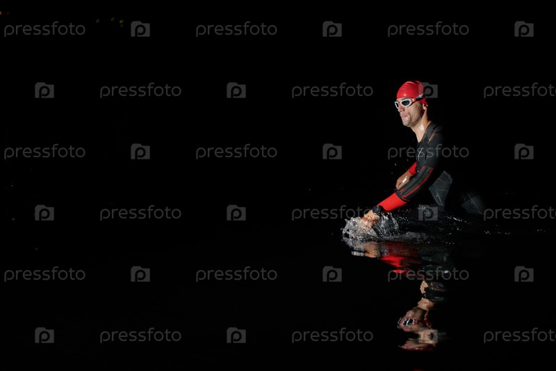 Настоящий пловец-триатлет, отдыхающий во время тяжелой тренировки ночью