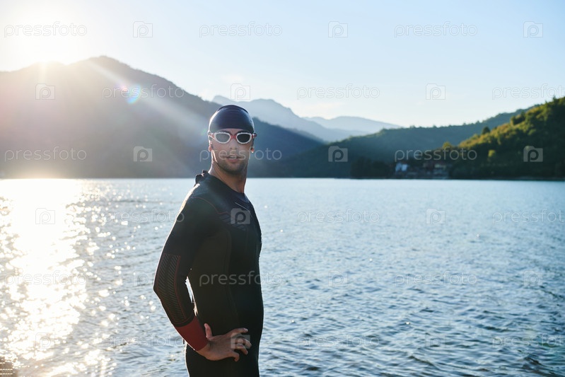 Настоящий спортсмен по триатлону готовится к тренировке по плаванию на озере