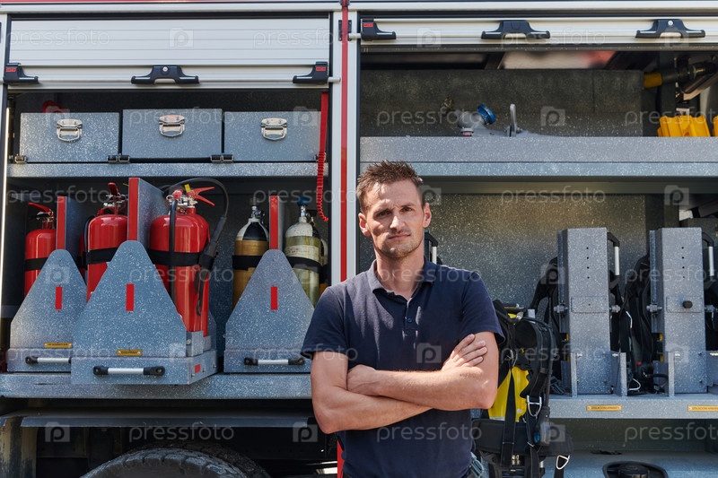 Уверенный в себе пожарный стоит со скрещенными руками, излучая стойкость и готовность, готовый реагировать на чрезвычайные ситуации рядом с современной пожарной машиной, демонстрируя героизм и силу пожарной службы