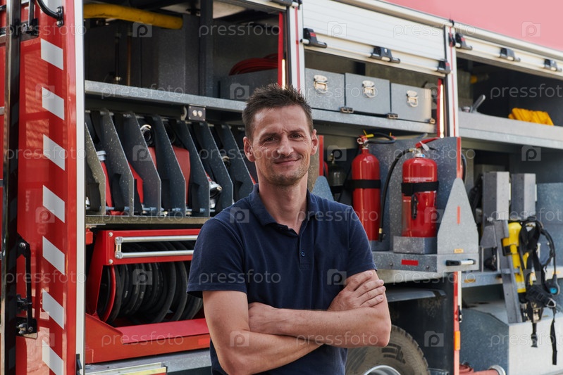 Уверенный в себе пожарный стоит со скрещенными руками, излучая стойкость и готовность, готовый реагировать на чрезвычайные ситуации рядом с современной пожарной машиной, демонстрируя героизм и силу пожарной службы