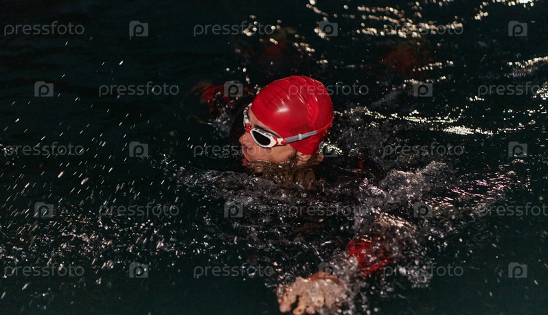 Решительный профессиональный триатлонист проходит тщательную ночную тренировку в холодной воде, демонстрируя преданность делу и стойкость в подготовке к предстоящим соревнованиям по триатлону по плаванию