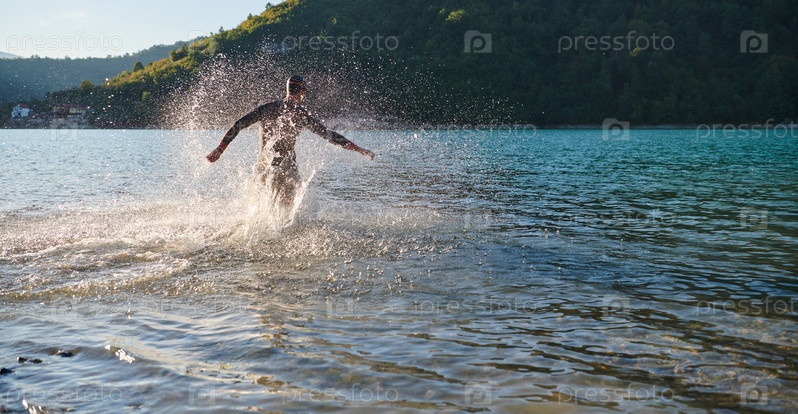 Спортсмен по триатлону начинает тренировку по плаванию на озере