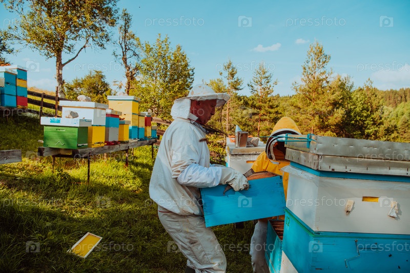 Пчеловоды проверяют мед на рамке улья в поле. Владельцы малого бизнеса на пасеке. Производитель натуральных здоровых продуктов питания работает с пчелами и ульями на пасеке