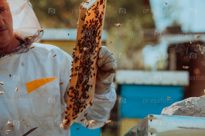 Пчеловод проверяет мед на рамке улья в поле. Владелец малого бизнеса на пасеке. Производитель натуральных здоровых продуктов питания работает с пчелами и ульями на пасеке