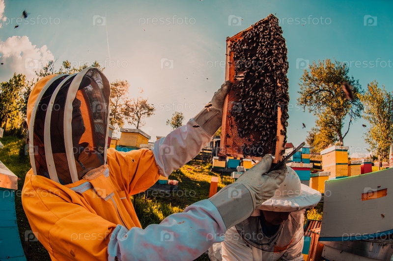 Пчеловоды проверяют мед на рамке улья в поле. Владельцы малого бизнеса на пасеке. Производитель натуральных здоровых продуктов питания работает с пчелами и ульями на пасеке