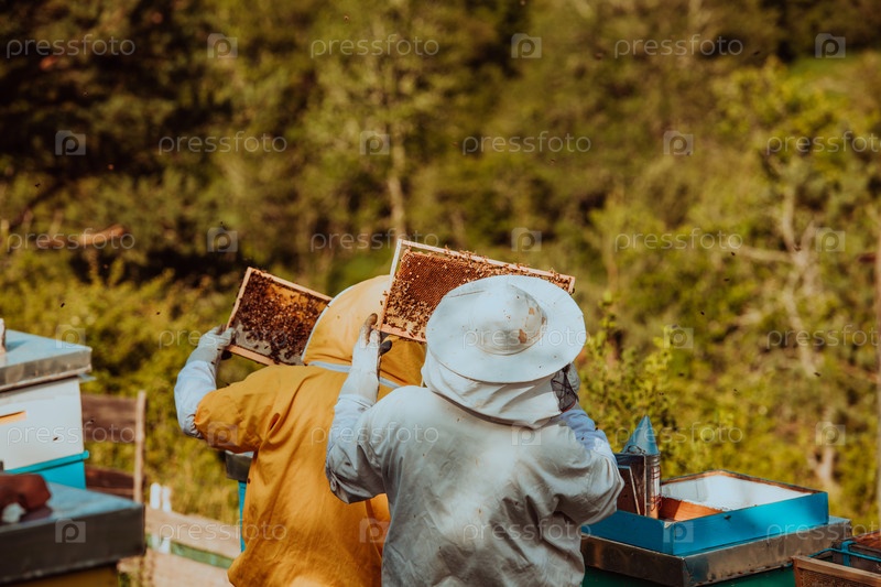 Пчеловоды проверяют мед на рамке улья в поле. Владельцы малого бизнеса на пасеке. Производитель натуральных здоровых продуктов питания работает с пчелами и ульями на пасеке