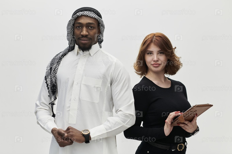 Арабский предприниматель и деловая женщина, излучающие уверенность и единство, позируют вместе на чистом белом фоне, символизируя динамичное партнерство, характеризующееся амбициями, инновациями и совместным успехом в сфере бизнеса