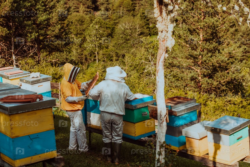 Пчеловоды проверяют мед на рамке улья в поле. Владельцы малого бизнеса на пасеке. Производитель натуральных здоровых продуктов питания работает с пчелами и ульями на пасеке
