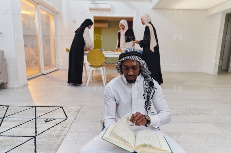 В священный месяц Рамадан афроамериканец-мусульманин, поглощенный чтением Священного Корана, окружен фоном, на котором три женщины в хиджабе готовят и подают еду для ифтара, изображая сцену духовной преданности, культурного единства и общественного праздн