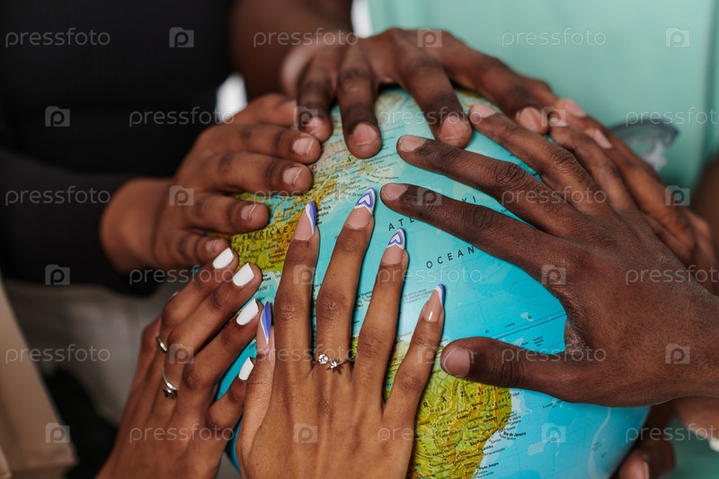 Крупный план рук разных подростков, деликатно исследующих земной шар, отражающих суть любопытства и исследований в их тактильном взаимодействии с географическими знаниями