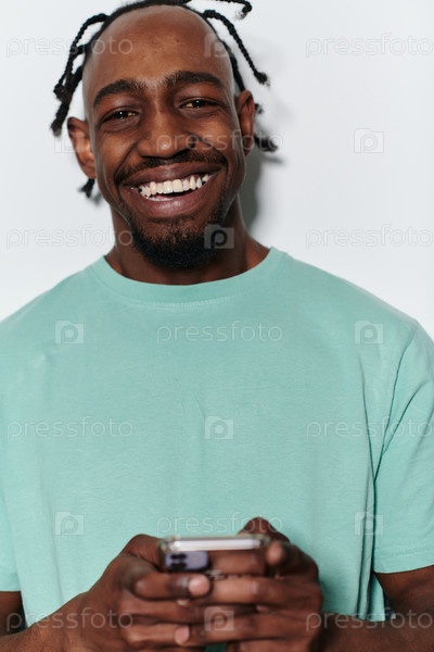 Афроамериканский подросток пользуется своим смартфоном на девственно белом фоне, воплощая суть современных цифровых технологий и молодежной культуры