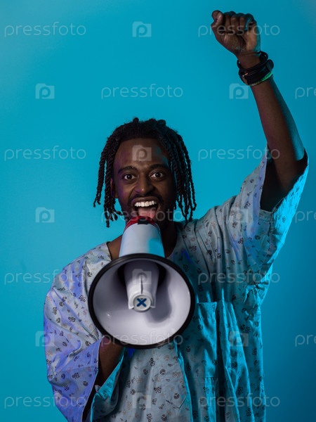 В мощном и символическом образе афроамериканец носит традиционную одежду, страстно размахивает мегафоном на ярком синем фоне, с поднятой рукой в воздухе, символизирующей его вокальные и культурные возможности в стремлении к социальной справедливости и рав