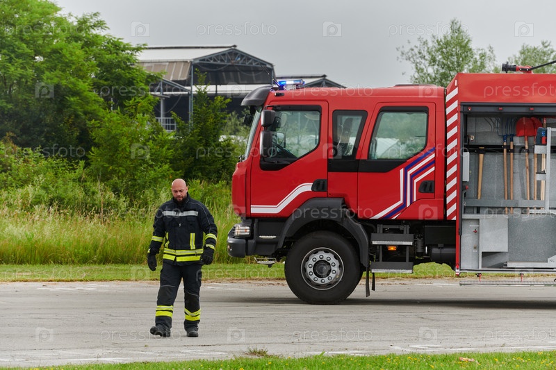 Символически храбрый пожарный шагает вперед с непоколебимым мужеством, олицетворяя самоотверженность и лидерство, в то время как позади него стоит современная пожарная машина, готовая к тушению пожара, отражающая суть героизма и готовности перед лицом чре