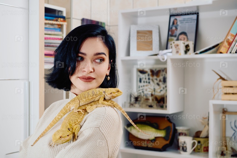 Красивая женщина позирует со своими двумя очаровательными бородатыми драконами