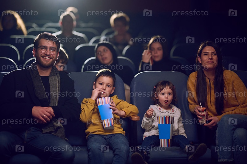 Современная семья приятно проводит время вместе в кинотеатре, наслаждаясь попкорном во время просмотра фильма со своими детьми