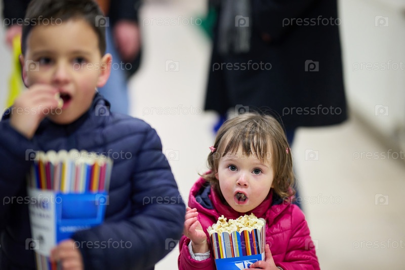 Брат и его младшая сестра с радостью делятся пакетом попкорна, направляясь вместе в кино на просмотр фильма, олицетворяя тепло братской связи и предвкушение предстоящего фильма