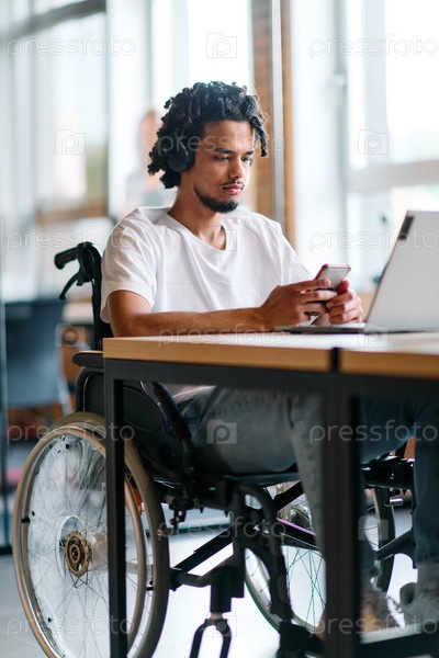 Афро-американский бизнесмен в инвалидной коляске делает перерыв в работе, используя свой смартфон, сидя в современном коворкинг-центре для стартапов, что отражает как инклюзивность, так и технологическую интеграцию
