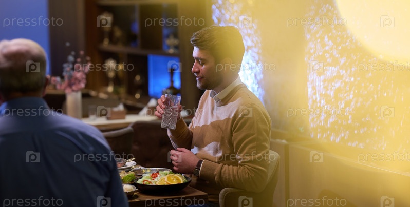 Сын и его пожилой отец ведут душевную беседу, терпеливо ожидая ифтара, способствуя укреплению связи между поколениями и заветным моментам семейной связи