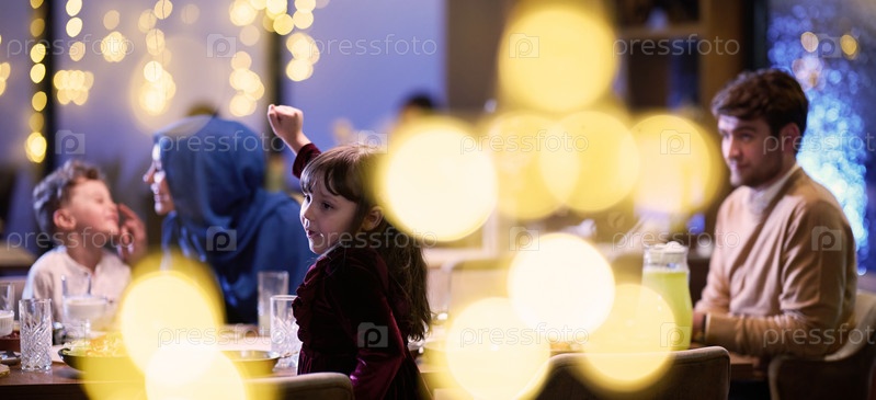 В современном ресторане исламская пара и их дети с радостью ждут ифтара во время священного месяца Рамадан, олицетворяя семейную гармонию и культурный праздник в современной обеденной атмосфере