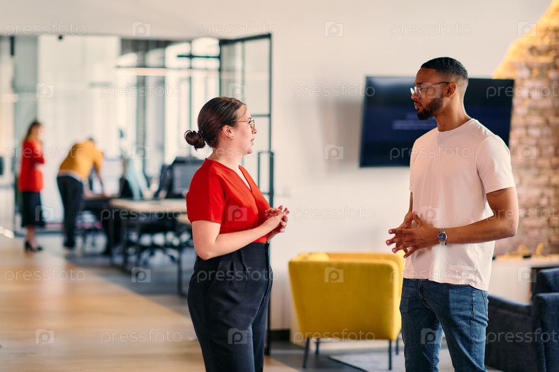 Молодые коллеги по бизнесу, в том числе афроамериканский бизнесмен, обсуждают деловые вопросы в коридоре современного стартап-коворкинг-центра, демонстрируя динамичное решение проблем и сотрудничество
