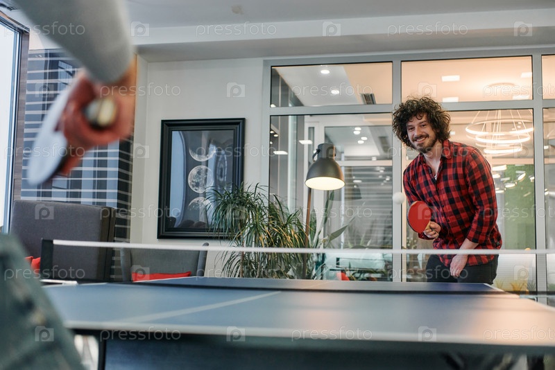 Коллеги по бизнесу отдыхают от работы, чтобы насладиться игрой в настольный теннис, способствуя командной работе и духу товарищества на рабочем месте