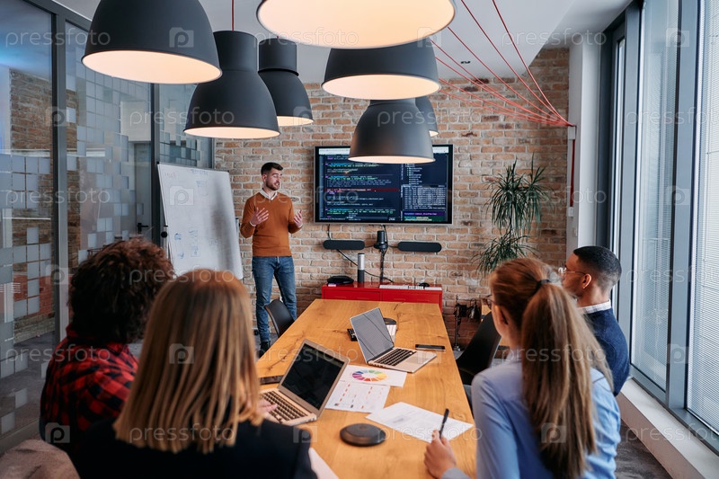 В корпоративной обстановке бизнесмен проводит встречу, страстно представляя бизнес-план своей внимательной команде, способствуя сотрудничеству и стратегическому мышлению