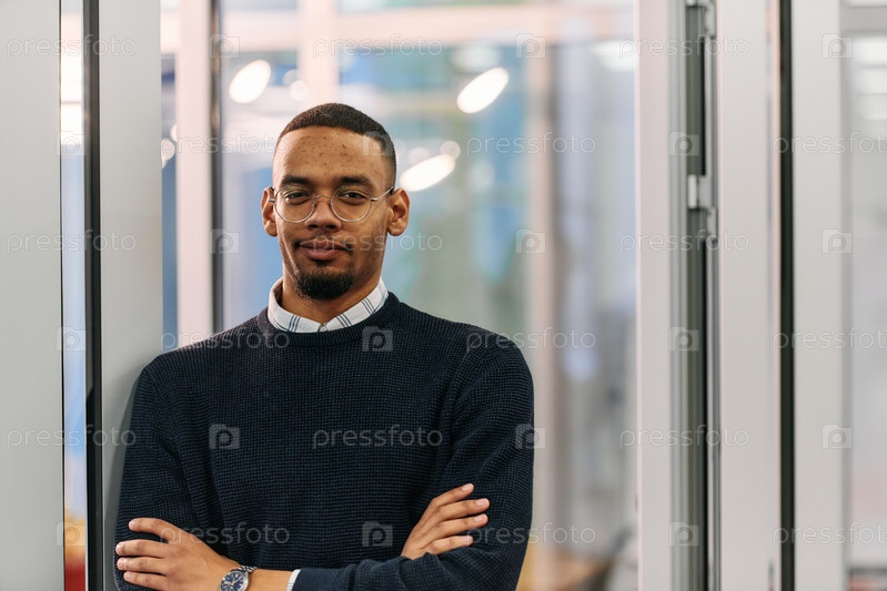 Афро-американский бизнесмен позирует со скрещенными руками в современном офисе