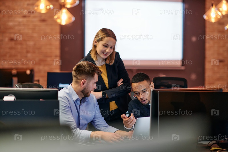 Стратегическая деловая встреча: группа профессионалов, сотрудничающих в офисе с помощью компьютеров