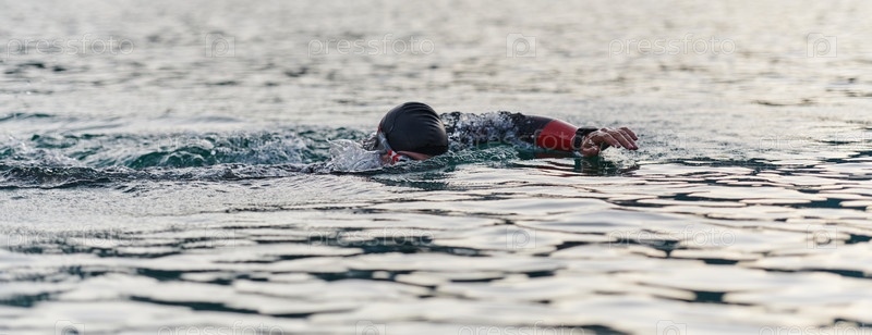 Профессиональный триатлонист с непоколебимой преданностью тренируется перед предстоящими соревнованиями на озере, излучая чувство атлетизма и глубокое стремление к совершенству