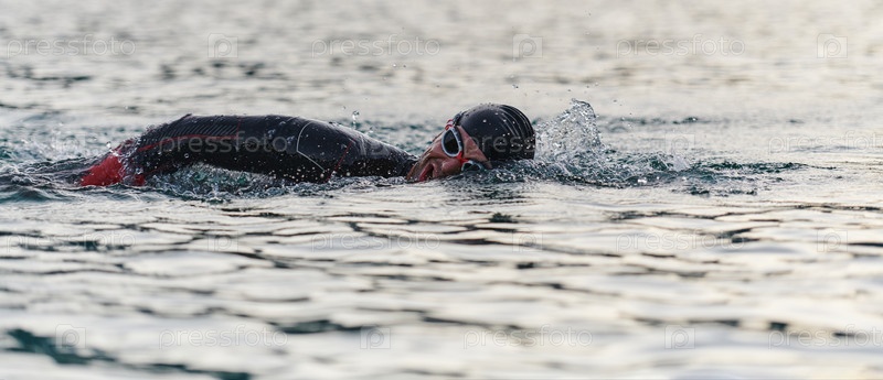 Профессиональный триатлонист с непоколебимой преданностью тренируется перед предстоящими соревнованиями на озере, излучая чувство атлетизма и глубокое стремление к совершенству