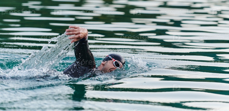 Профессиональный триатлонист с непоколебимой преданностью тренируется перед предстоящими соревнованиями на озере, излучая чувство атлетизма и глубокое стремление к совершенству