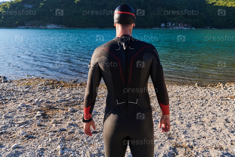 Настоящий спортсмен по триатлону готовится к тренировке по плаванию на озере