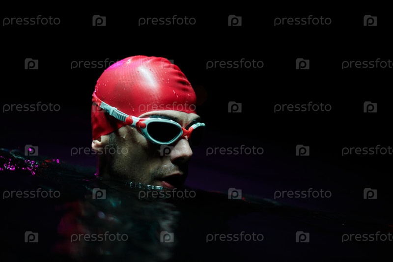 Решительный профессиональный триатлонист проходит тщательную ночную тренировку в холодной воде, демонстрируя преданность делу и стойкость в подготовке к предстоящим соревнованиям по триатлону по плаванию