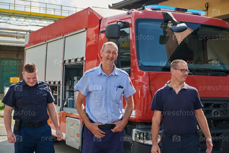 Квалифицированная и преданная своему делу профессиональная команда пожарных с гордостью позирует перед своей современной пожарной машиной, демонстрируя свое современное оборудование и приверженность обеспечению общественной безопасности