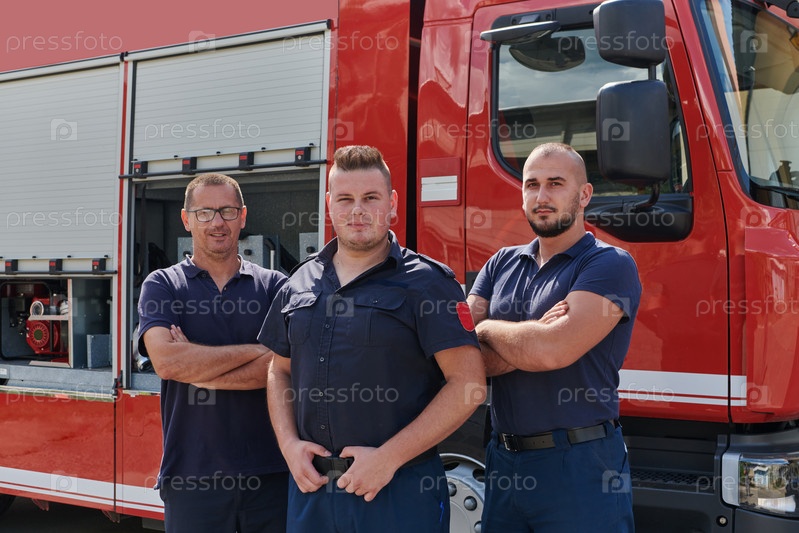 Квалифицированная и преданная своему делу профессиональная команда пожарных с гордостью позирует перед своей современной пожарной машиной, демонстрируя свое современное оборудование и приверженность обеспечению общественной безопасности