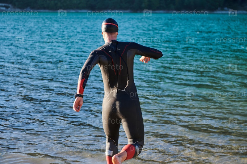 Спортсмен по триатлону начинает тренировку по плаванию на озере