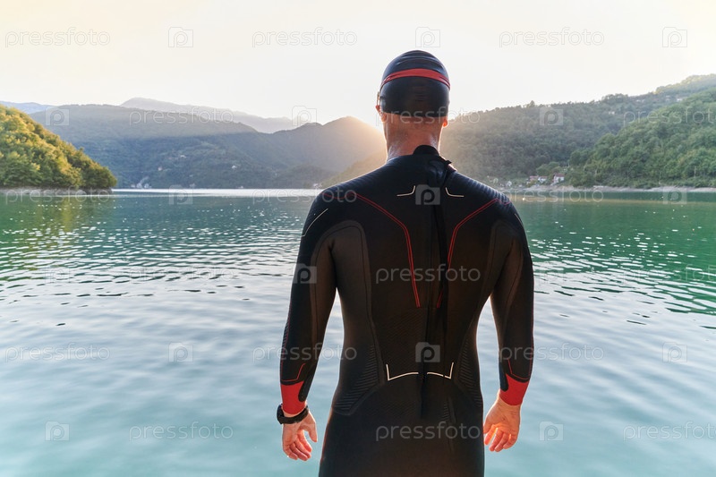 Настоящий спортсмен по триатлону готовится к тренировке по плаванию на озере