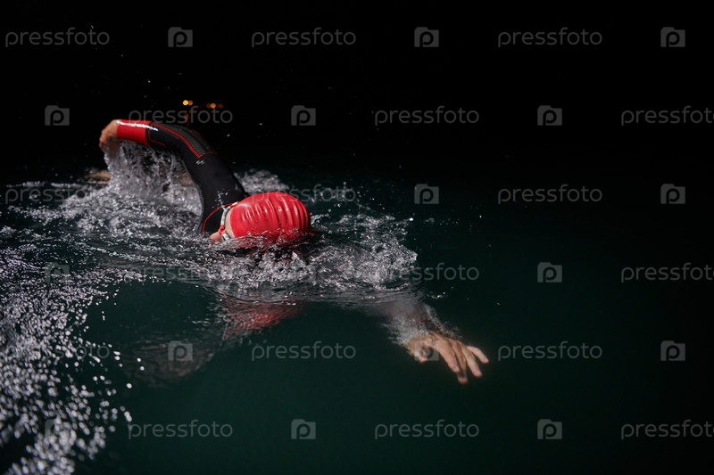 Решительный профессиональный триатлонист проходит тщательную ночную тренировку в холодной воде, демонстрируя преданность делу и стойкость в подготовке к предстоящим соревнованиям по триатлону по плаванию