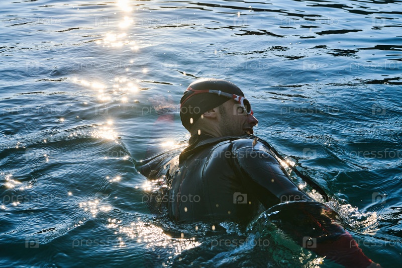 Спортсмен по триатлону плавает на озере на рассвете в гидрокостюме