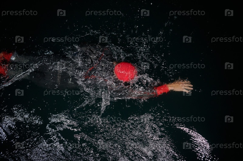 Решительный профессиональный триатлонист проходит тщательную ночную тренировку в холодной воде, демонстрируя преданность делу и стойкость в подготовке к предстоящим соревнованиям по триатлону по плаванию