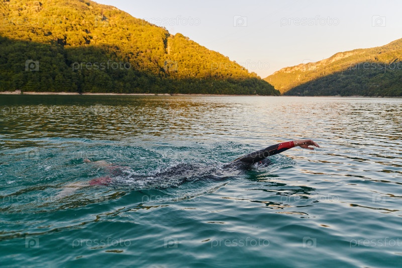 Спортсмен по триатлону плавает на озере на рассвете в гидрокостюме