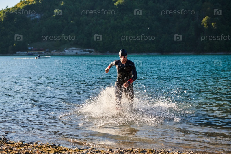 Спортсмен по триатлону начинает тренировку по плаванию на озере