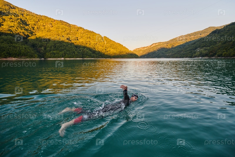 Спортсмен по триатлону плавает на озере на рассвете в гидрокостюме