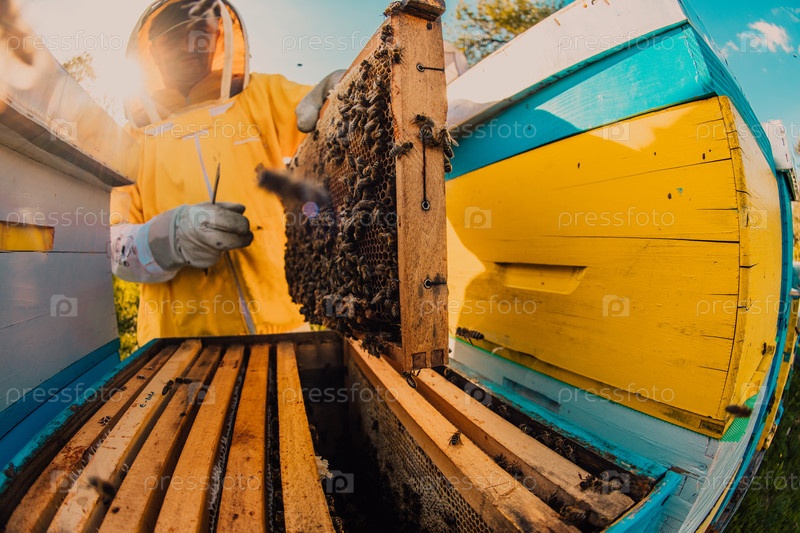 Пчеловод проверяет мед на рамке улья в поле. Владелец малого бизнеса на пасеке. Производитель натуральных здоровых продуктов питания работает с пчелами и ульями на пасеке